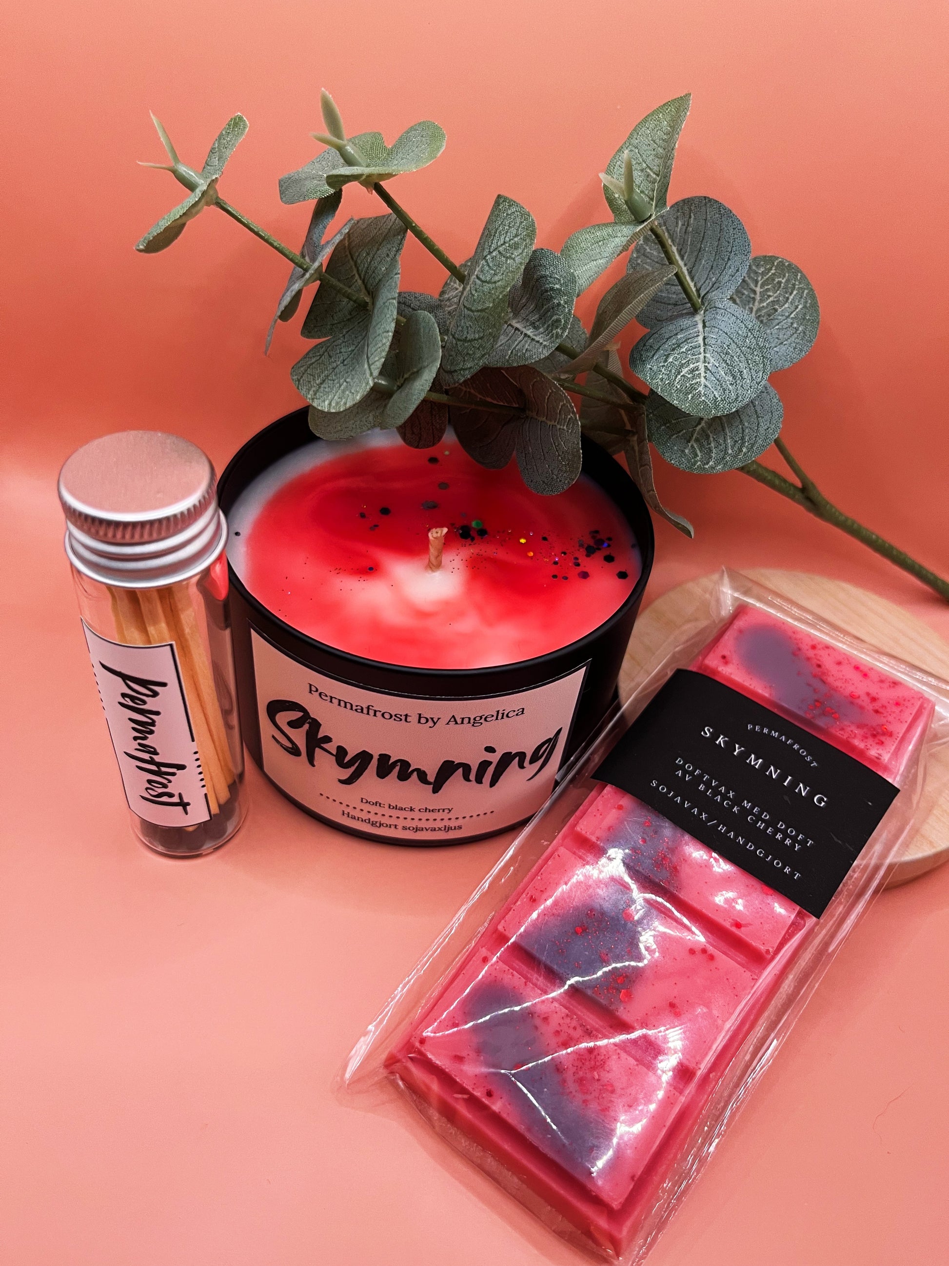 Ett set med doften Skymning, en underbart sensuell doft av black cherry. Detta set innehåller ett doftljus, ett doftvax och en ask Make it count-tändstickor med svart tipp. Perfekt att ge bort i present eller unna sig själv.